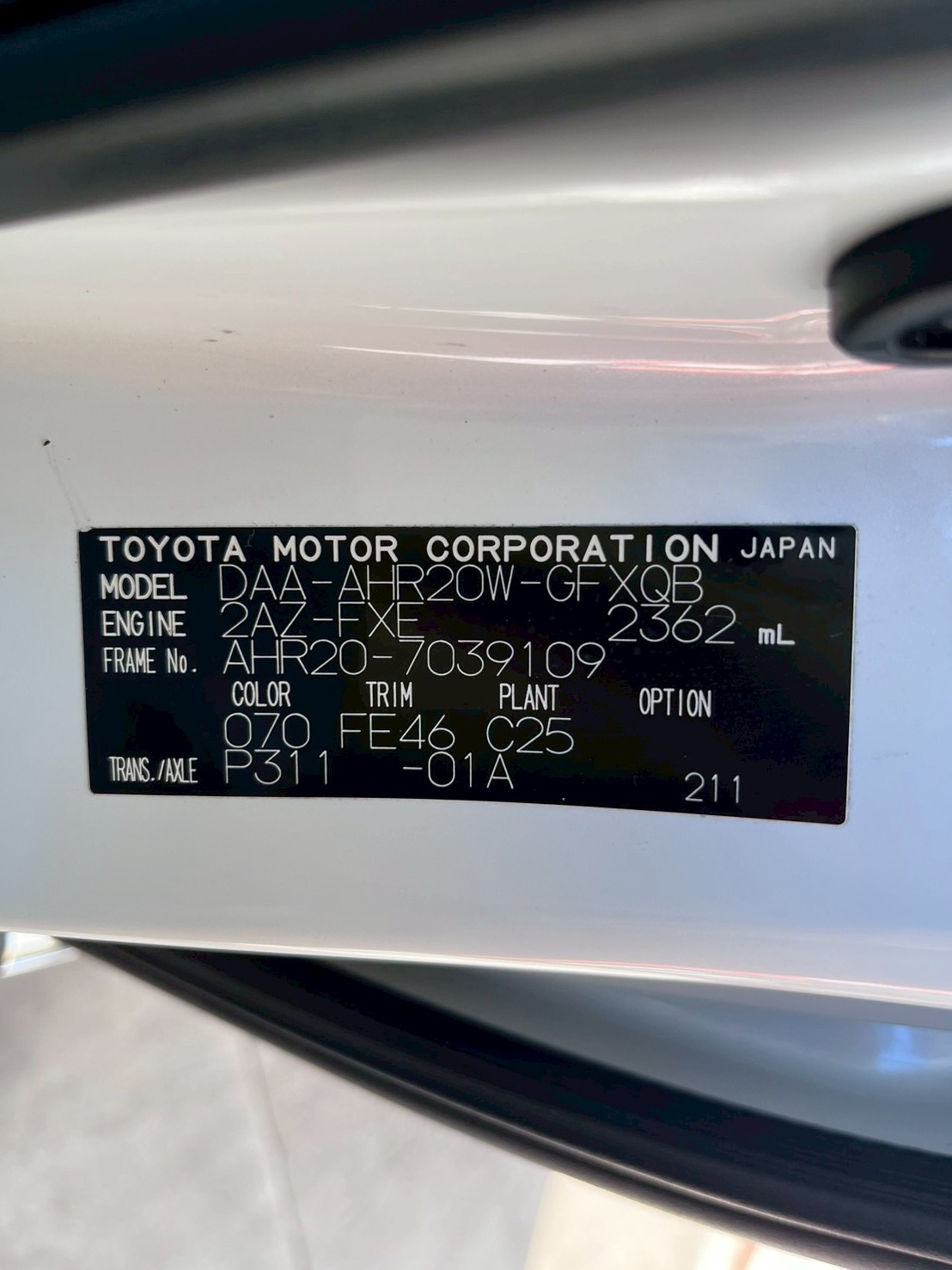 - 車台番号 AHR20-7039109